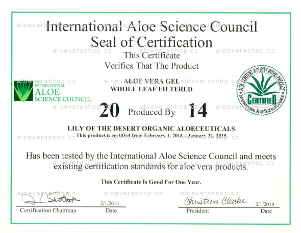 Potvrzuje, že společnost Lily of the Desert kontroluje kvalitu svého Aloe vera od obdělávání půdy po plnění do obalů. Tak nedochází k znehodnocení účinných složek Aloe vera.