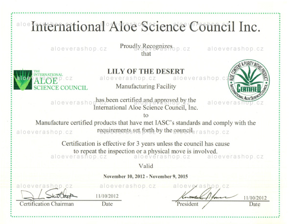 . certifikace IASC (Mezinárodní vědecká rada pro aloe)